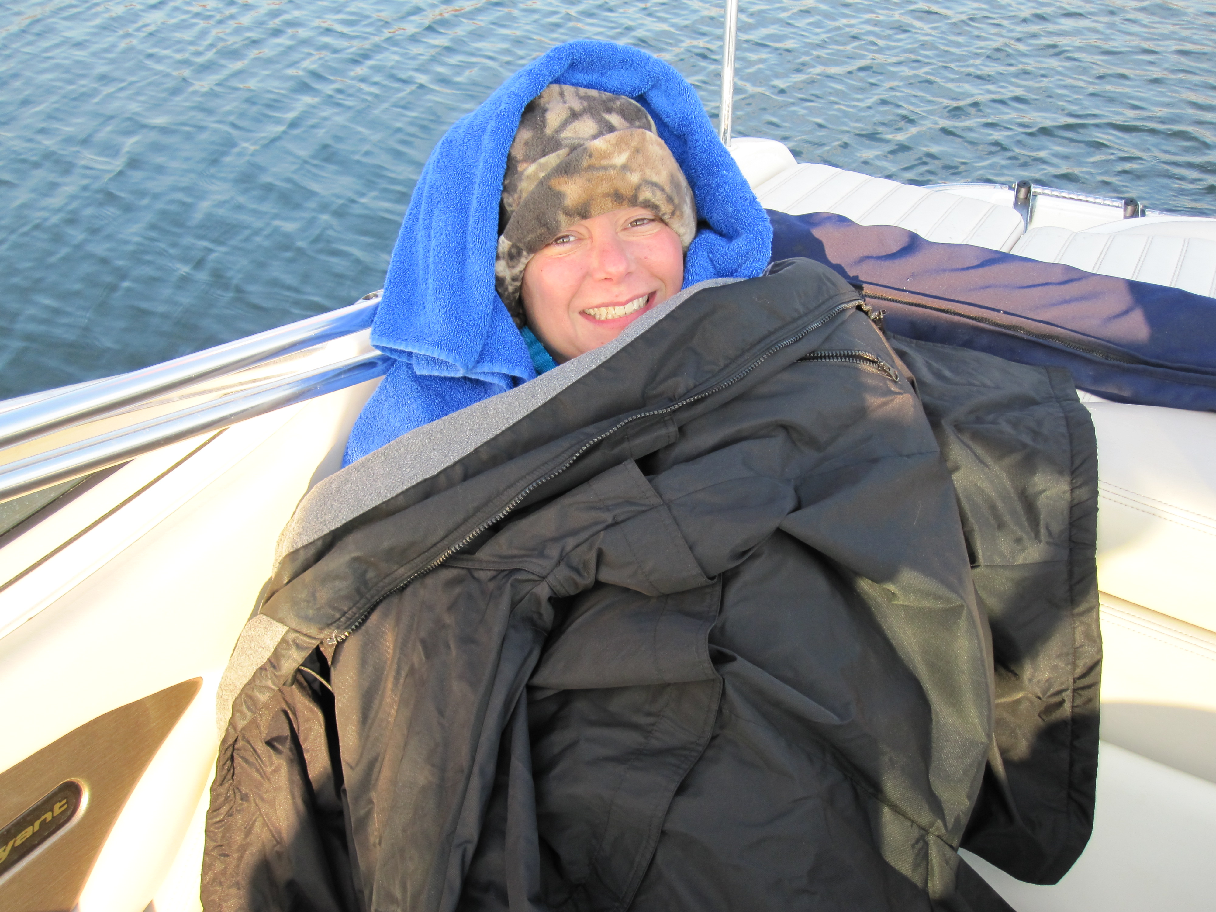 As planned, we headed to Deltaville on November 14th. Matt and my friends Tom and Frank came along to help crew. We loaded the boat and took the water temperature at the dock – 53! Not a good sign…but, I crossed my fingers and we headed out into the river. We decided to wait until the sun got a little higher in the sky and at jump time the water temp had risen to a balmy 54. I screamed REALLY loudly after I jumped in! I think I scared everyone on the boat – but, screaming helps me deal with the shock of the cold. Frank told me later that it was sort of like a train wreck….he wanted to look but was kind of afraid to! At 1 1/2 hours in – I was done. I felt like I could have gone on a bit longer – but, knew I wasn’t going to make it to 4 hours. So, rather than take the risk – I decided to get out.