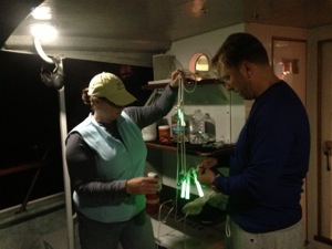 Courtney’s left Catalina in the dust! It’s but a distant glimmer in the background from our boat. The stars above blanket the sky; Courtney and the crew couldn’t be more grateful for this clear night. Matt reports that the current water temperature is 67.3. This will likely drop, and later fluctuate, throughout the channel. Stroke count is 59.